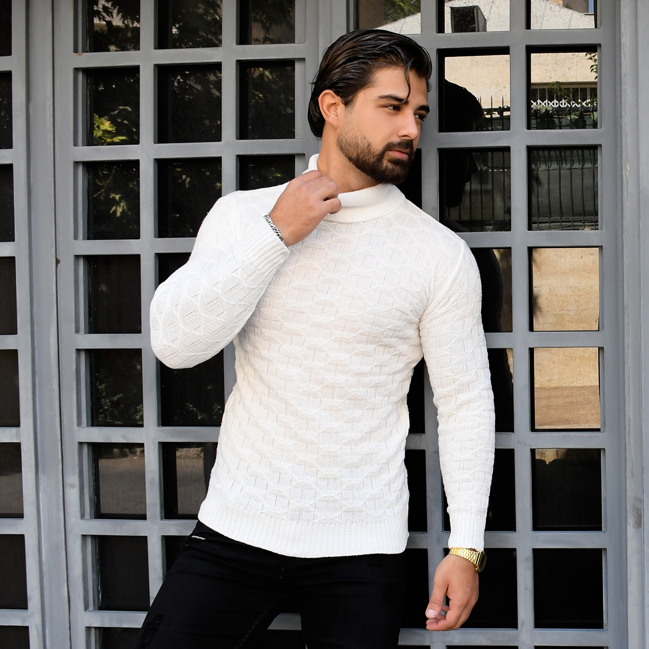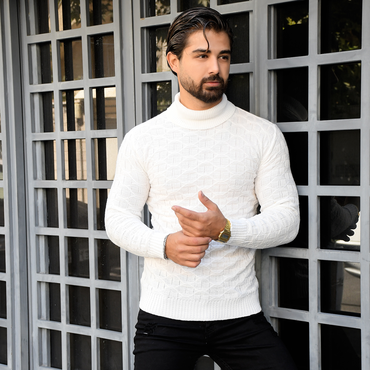 پلیور یقه اسکی سفید طرح لوزی مردانه مدلG10